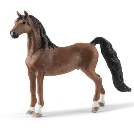 American Saddlebreds are well-known for keeping their heads and their beautifully curved tail high - like the American Saddlebred gelding by Schleich® Horse Club. The horse breed has a balanced even-tempered nature and is extremely willing to perform. Some American Saddlebreds master two additional gaits the slow gait and the so-called rack gait.